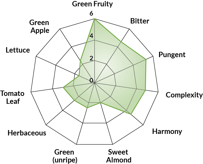 - Molt aromàtic en verd, destaca per la seva lleugeresa al paladar, cosa que el converteix en una excel·lent opció com a monovarietal suau o per equilibrar olis més intensos.