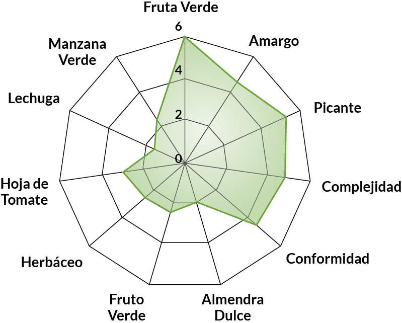 - Molt aromàtic en verd, destaca per la seva lleugeresa al paladar, cosa que el converteix en una excel·lent opció com a monovarietal suau o per equilibrar olis més intensos.