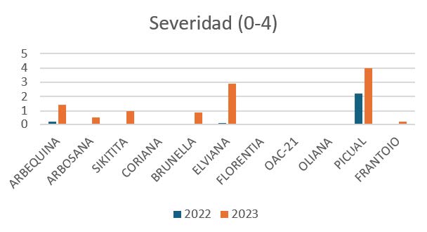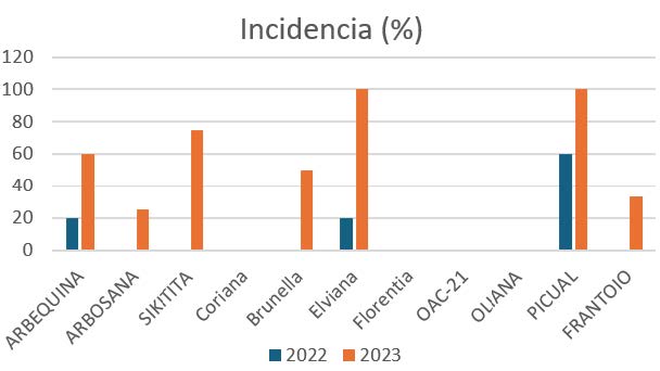 The most sensitive cultivar was ‘Picual’, which in 2023 reached maximum severity values and showed 100% incidence and mortality.